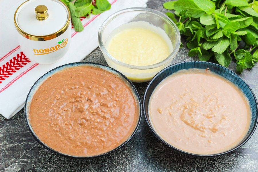 Помните, что формочка для пасхи — узкая, поэтому в емкость с белым шоколадом выложите четверть массы, в емкость с молочным шоколадом — чуть больше, а больше всего массы добавьте в емкость с черным шоколадом и тщательно перемешайте.