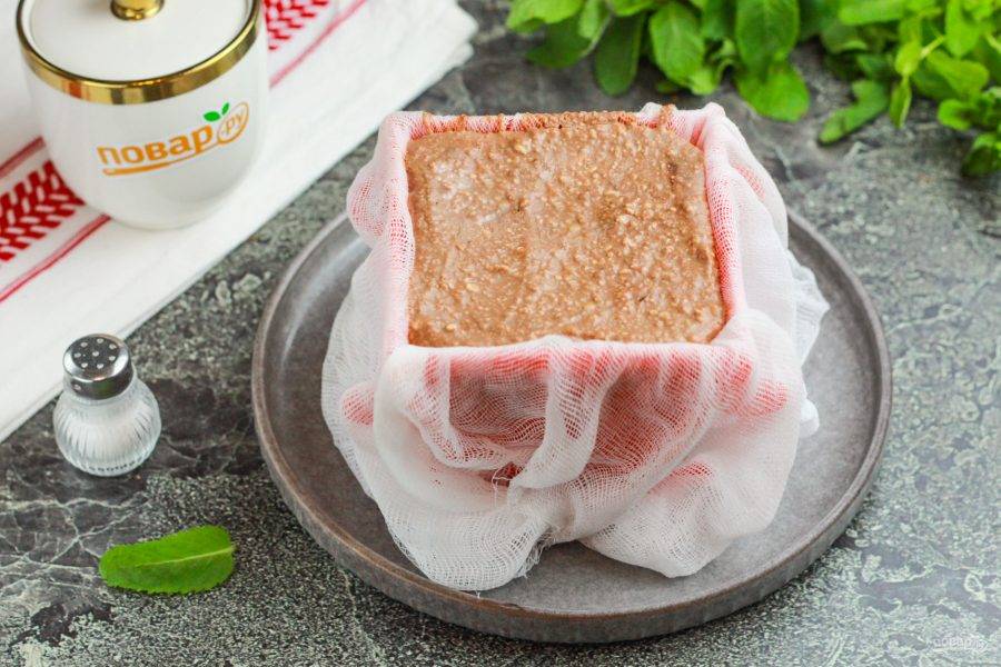 Застелите форму для пасхи двойным слоем марли, чтобы концы ткани свисали с боков формы. Выложите сначала слой с белым шоколадом и аккуратно разровняйте. На него — слой с молочным шоколадом, а последним — слой с черным шоколадом. Слегка постучите формочкой об тарелку, чтобы удалить пузырьки воздуха. Заверните края марли внутрь, выложите небольшой гнет и поместите пасху на холод.