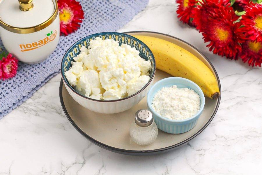 Подготовьте указанные продукты. Творог прогрейте при комнатной температуре за полчаса до начала приготовления блюда.