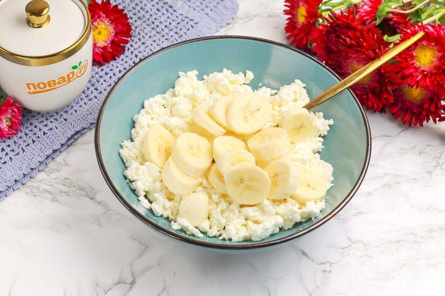 Очистите банан от кожуры и нарежьте кружочками, ломтиками. Добавьте в емкость к творогу.
