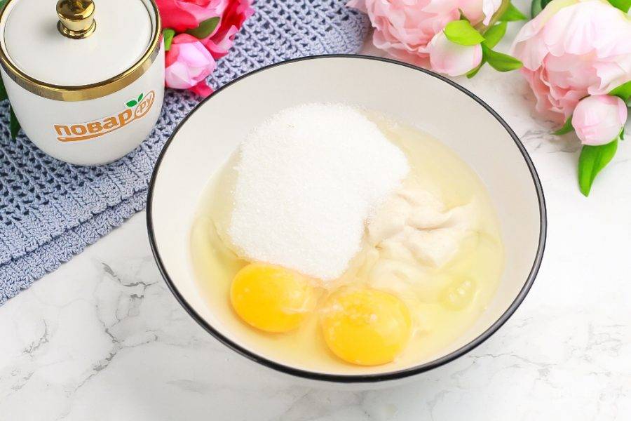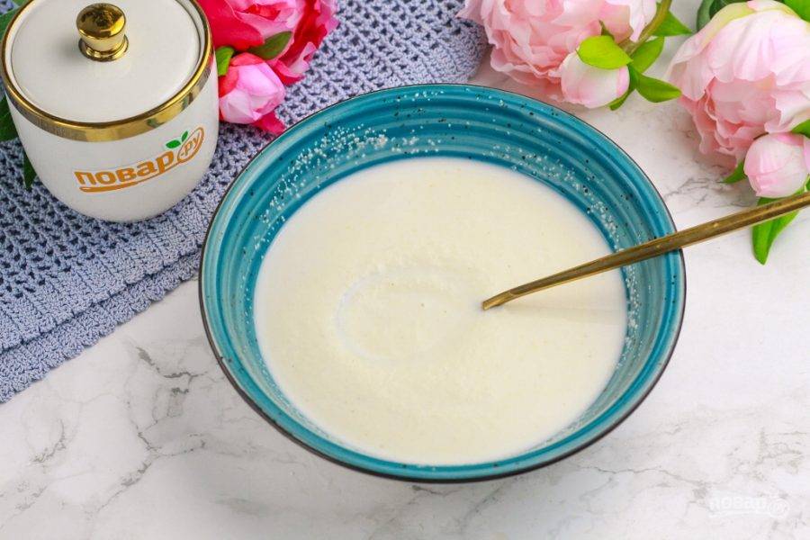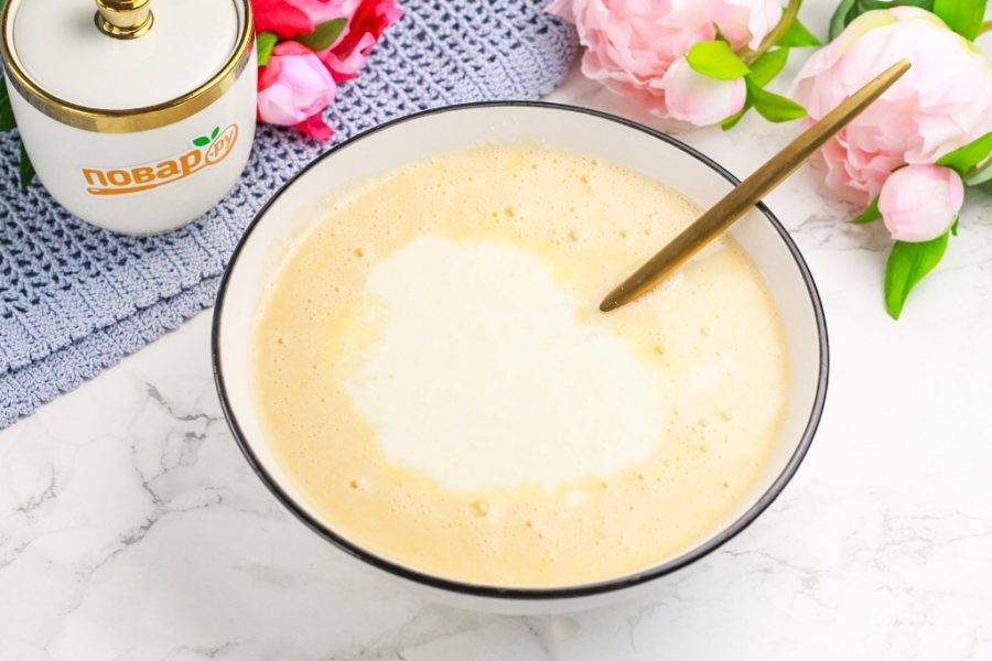 Спустя указанное время выложите сметану в глубокую емкость, вбейте туда же куриные яйца, всыпьте соль, сахар и ванильный сахар. Последний ингредиент можно заменить молотой корицей или другим ароматизатором. Тщательно все взбейте вилкой либо венчиком.