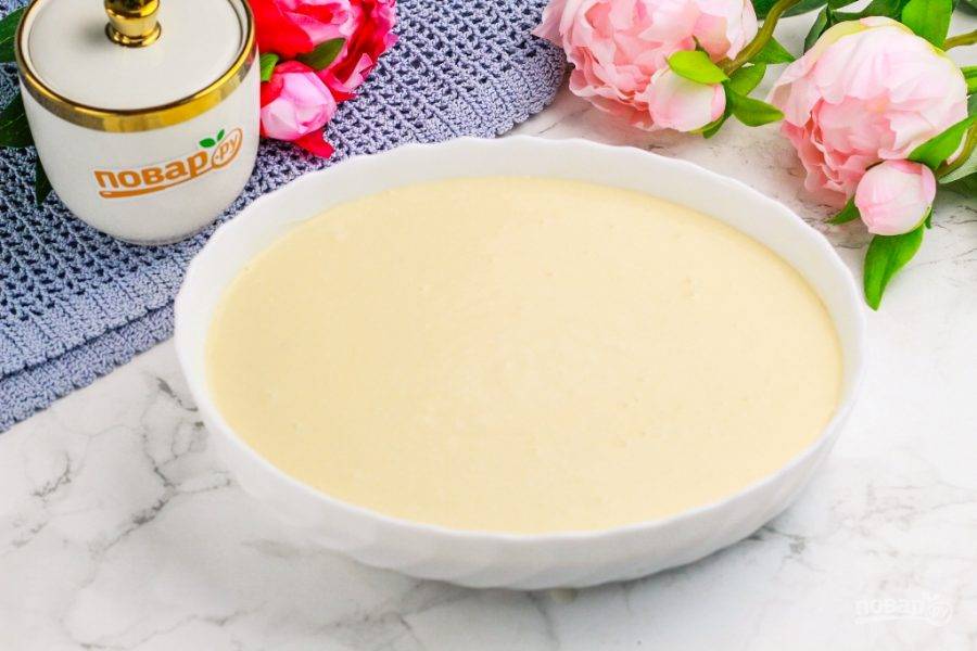 Смажьте форму для запекания растительным или сливочным маслом, влейте приготовленное творожное тесто.