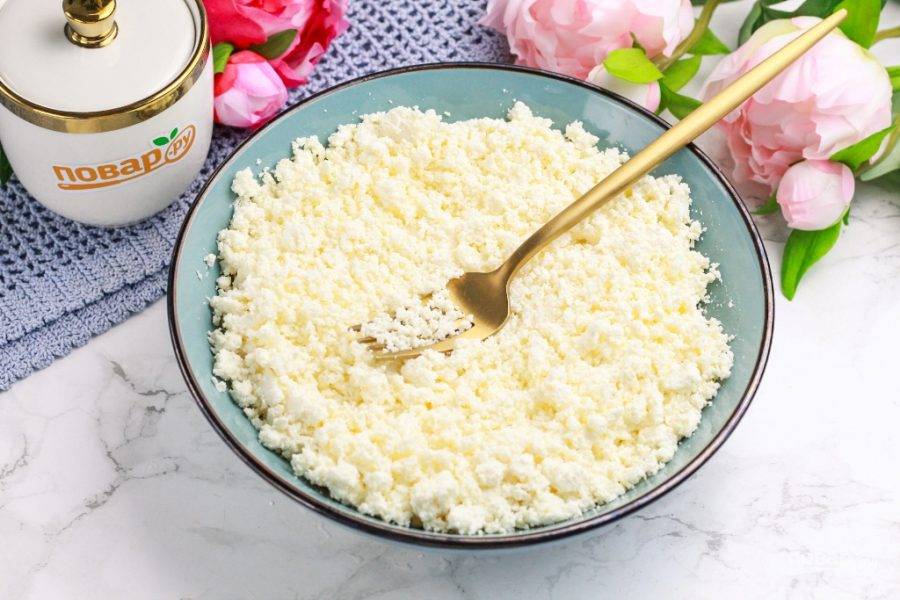 Выложите творог в глубокую емкость и тщательно перетрите вилкой или блендером (если он влажный), чтобы не осталось крупных ломтиков.