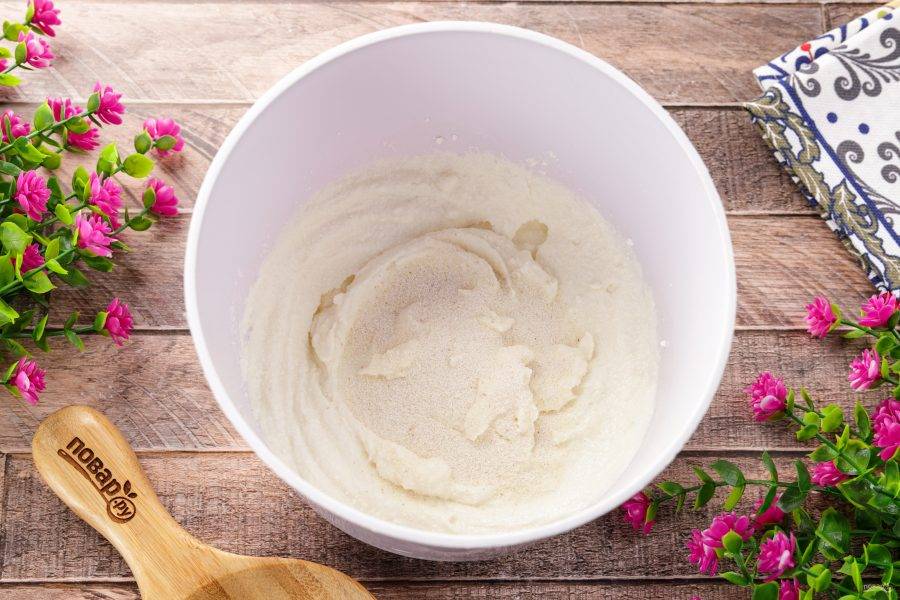 Добавьте творог, сахар, соль и ванилин.
