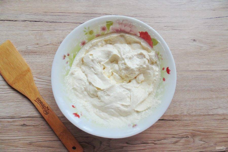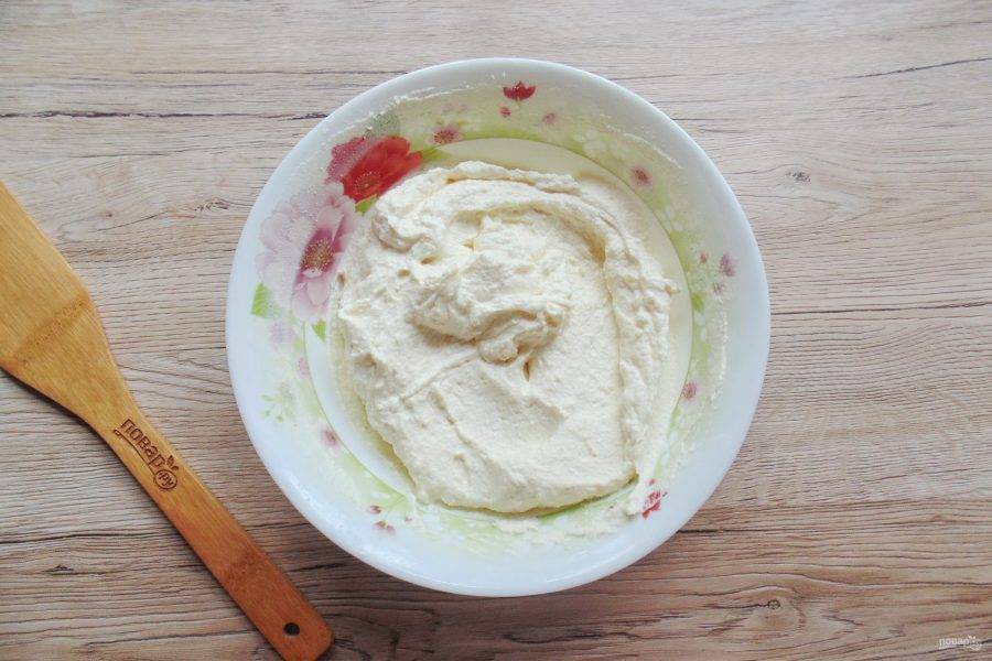 Творожную массу взбейте блендером до кремовой консистенции.