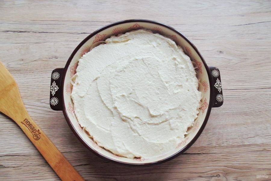 На фрукты выложите творожную массу и разровняйте.