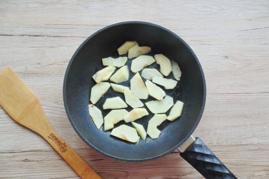 Вымойте яблоки, очистите, удалите семенную коробочку и нарежьте небольшими дольками. Выложите в сковороду и добавьте масло.