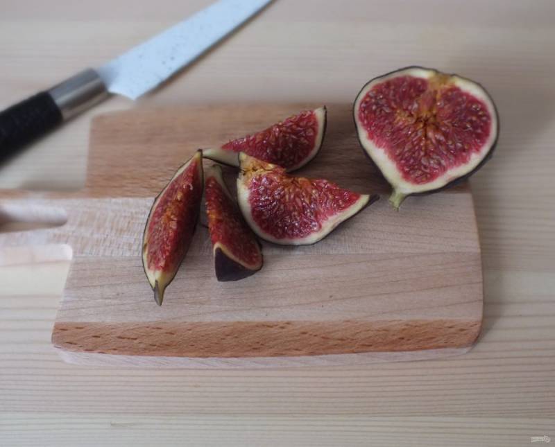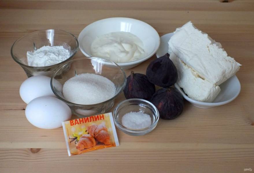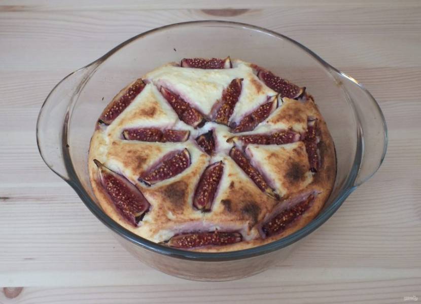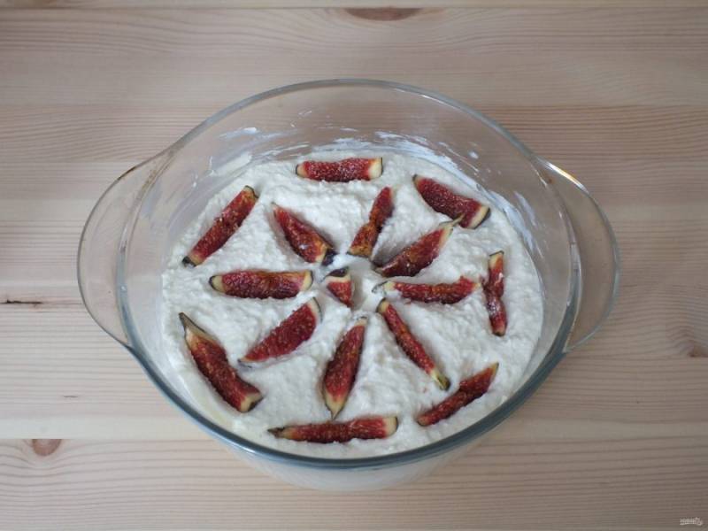 Дольки инжира разложите по творожной массе, слегка "утопив" их. Поставьте запеканку в разогретую духовку на 30 минут.