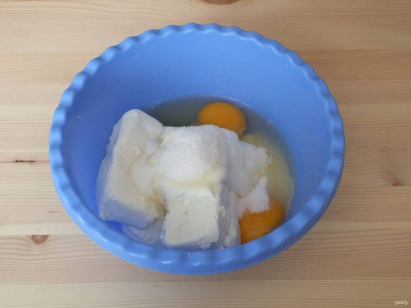 В чаше смешайте творог, яйца, сахар, соль, ванилин. Пробейте погружным блендером.