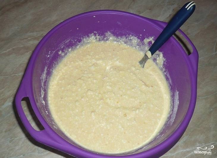 Теперь в тесто нужно высыпать все сухие ингредиенты, вылить кефир и очень хорошо перемешать массу. Тесто можно оставить минут на 10, чтобы манная крупа набухла.