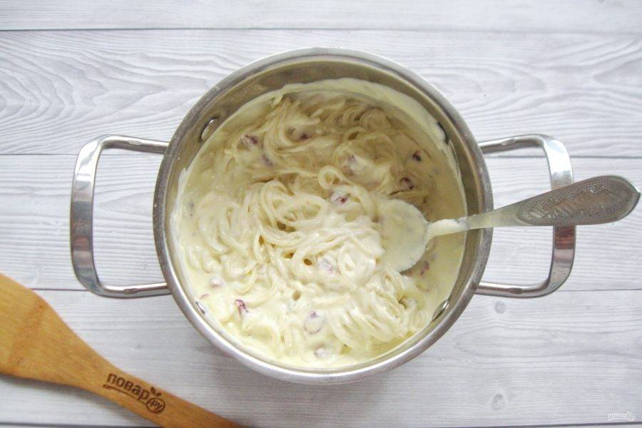 Взбитую творожную массу переложите в кастрюлю с макаронами. Добавьте вяленую вишню, предварительно разрезав каждую ягодку на половинки.
