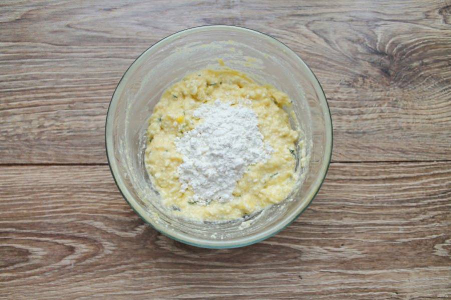 Все хорошенько перемешайте и всыпьте крахмал, перемешайте.