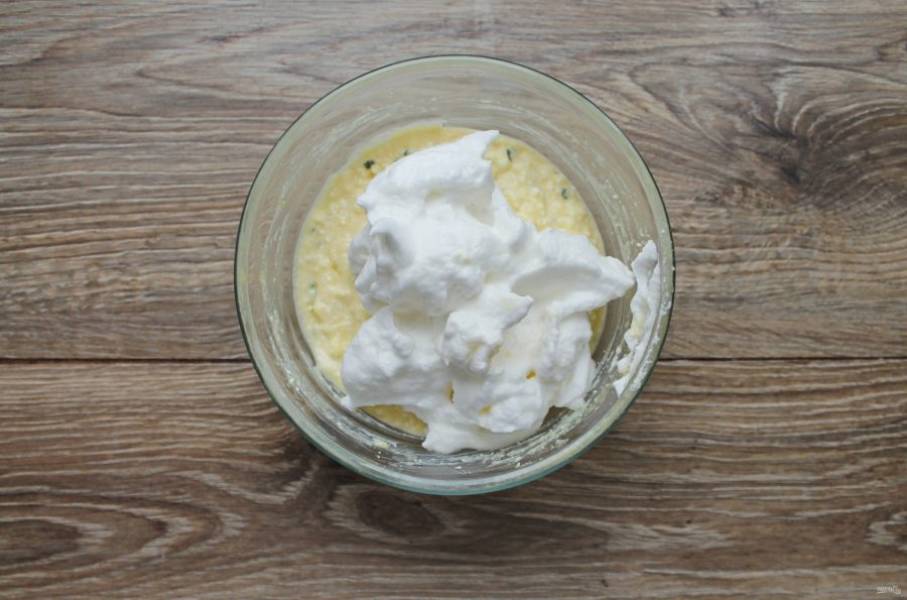 Яичные белки взбейте до плотных пиков и добавьте в миску с творожной массой. Все аккуратно перемешайте снизу вверх.
