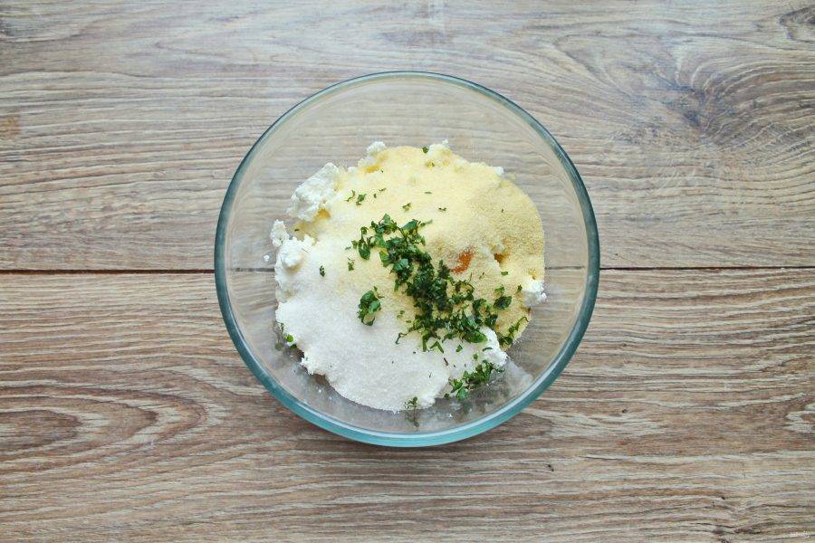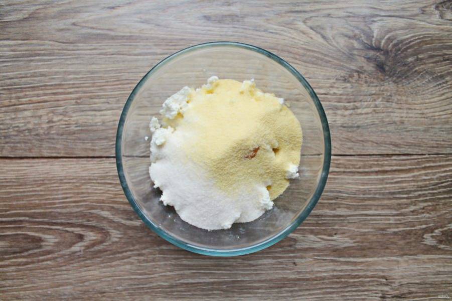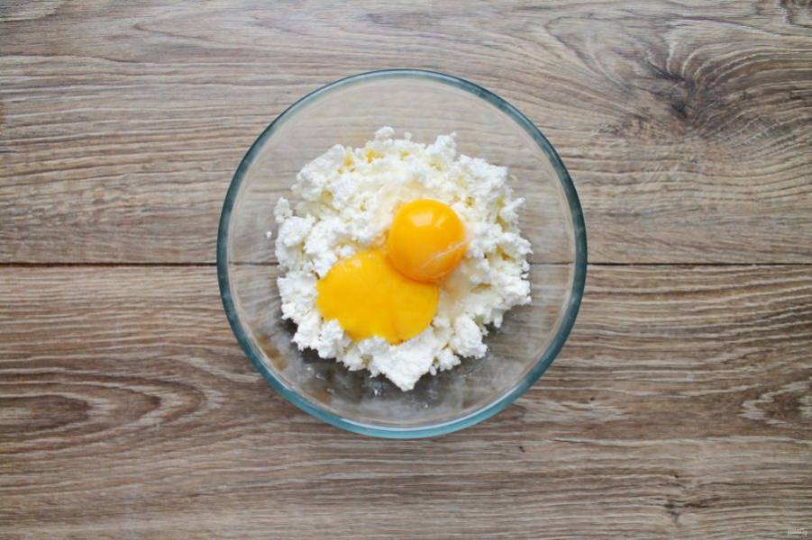 Яйца разделите на белки и желтки, белки пока уберите, они понадобятся позднее. Творог выложите в миску и добавьте яичные желтки.