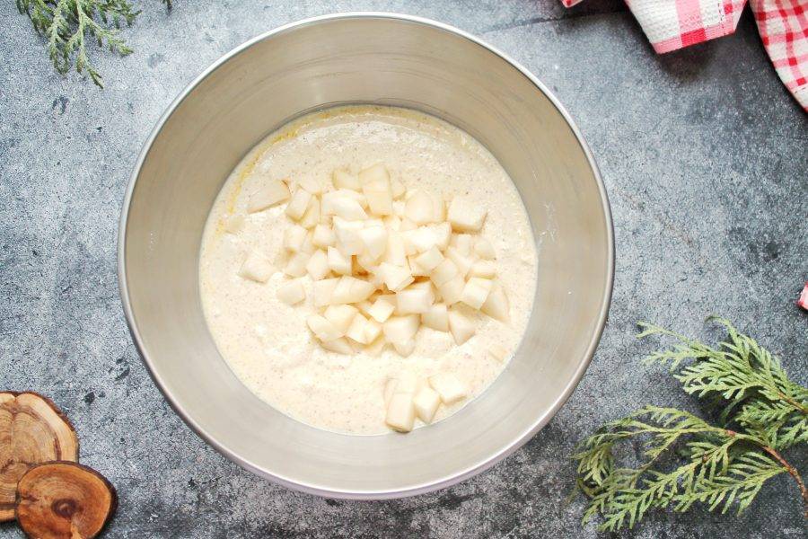 Грушу почистите от кожуры, сердцевины и порежьте мелким кубиком. Добавьте грушу в творог и перемешайте.