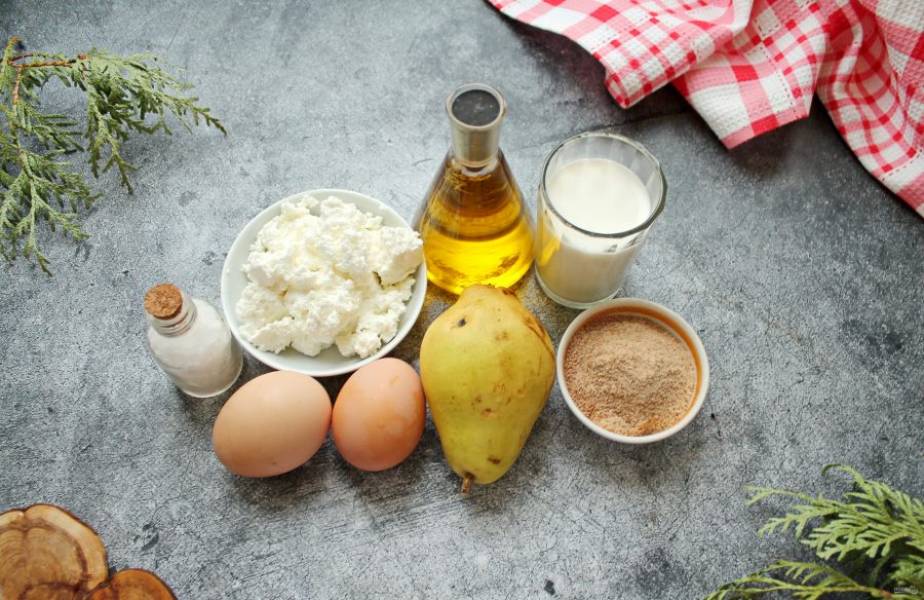 Подготовьте все необходимые ингредиенты для приготовления творожной запеканки с протеином в духовке. Грушу вымойте. Яйца разделите на белки и желтки.