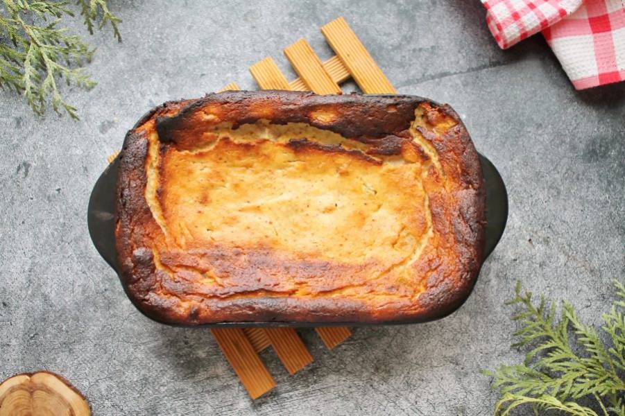 Поставьте форму в горячую духовку и готовьте творожную запеканку с протеином при температуре 180 градусов в течение 40-50 минут, до готовности. Готовую запеканку остудите и подавайте к столу.