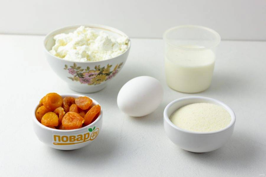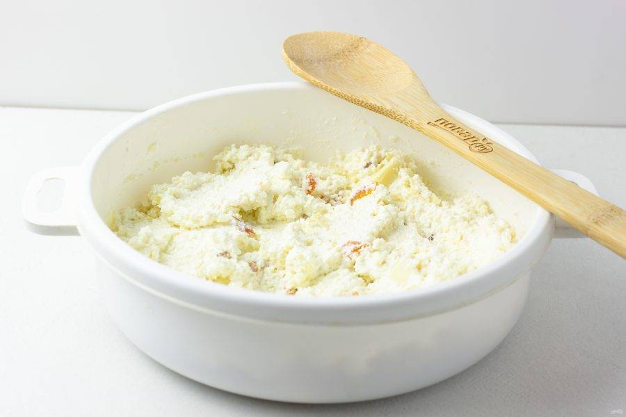 Творог, ванилин, молоко, яйцо и манку взбейте блендером или тщательно разотрите толкушкой для картофельного пюре до однородной массы.