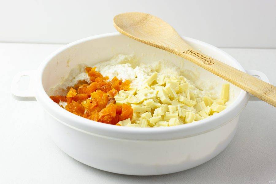 Добавьте рубленный на кусочки шоколад и кусочки кураги. Если у вас курага недостаточно мягкая, то предварительно замочите ее в кипятке на 10-15 минут.