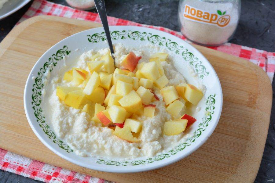 Затем добавьте нарезанные средними кубиками яблоки. Или можете натереть яблоки на терке. Я люблю, когда в запеканке чувствуются кусочки яблок.