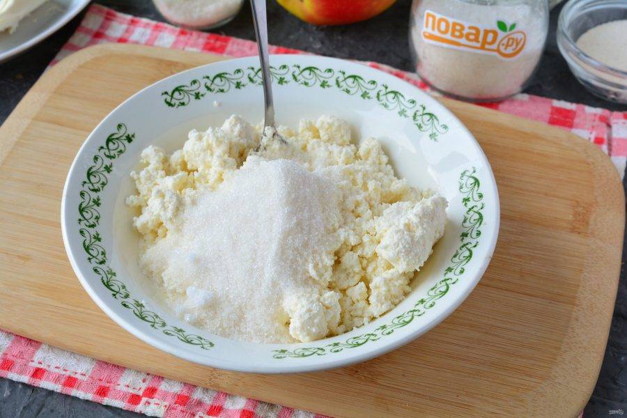 Смешайте творог любой жирности с сахаром, солью и ванильным сахаром.