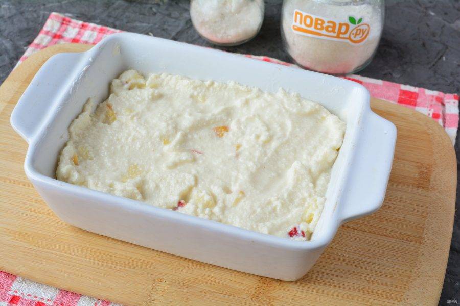 Форму для запекания смажьте сливочным маслом и выложите творожную массу, разровняйте.