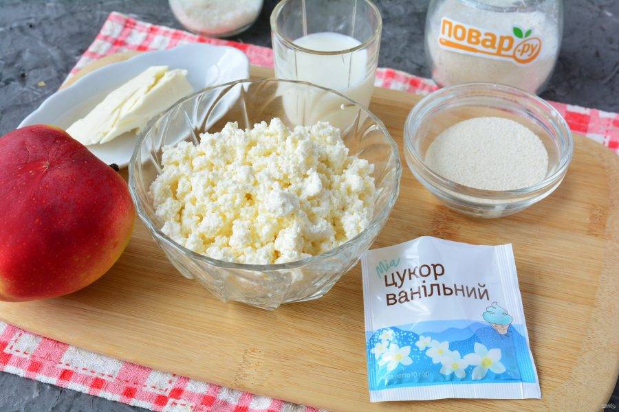 Всыпьте манную крупу и влейте молоко. Хорошо перемешайте творожную массу и отставьте на 20 минут, чтобы манка набухла.