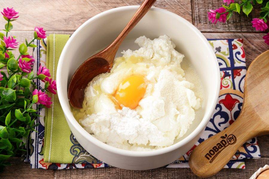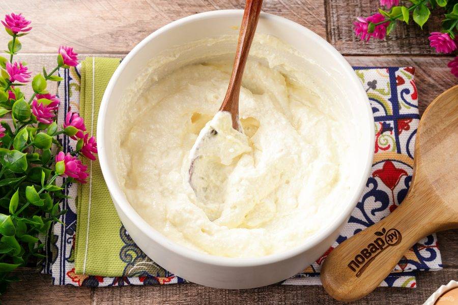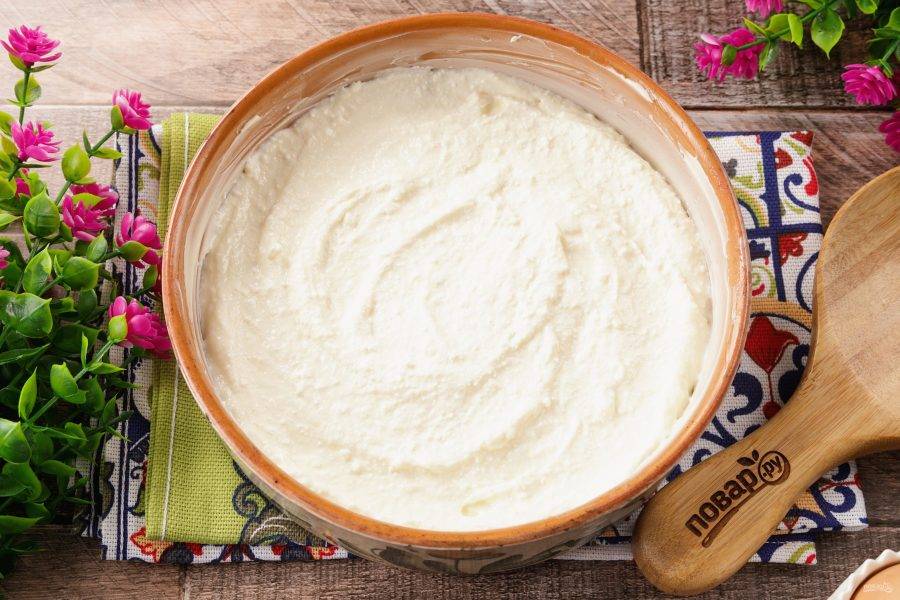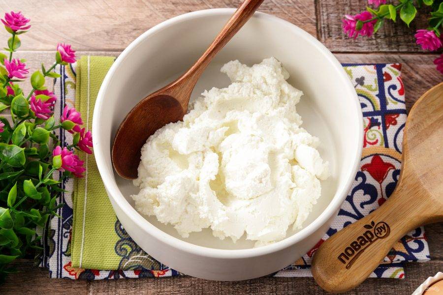 Творог измельчите в блендере или протрите через сито. Если у творога небольшие крупинки, то можно просто тщательно растереть вилкой.
