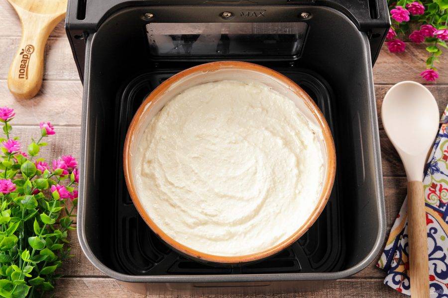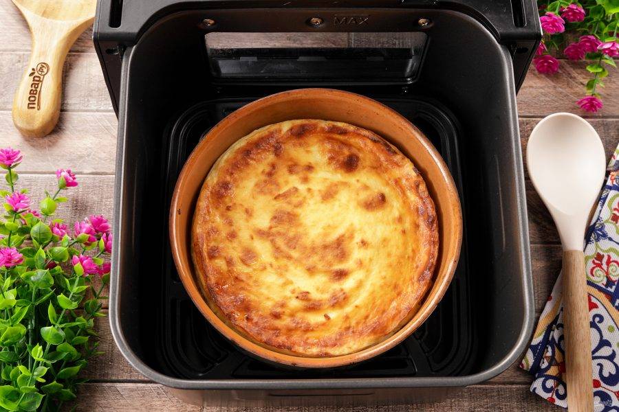 Поместите форму в чашу аэрогриля. Запекайте в аэрогриле при температуре 160 градусов 20 минут. Когда прозвучит сигнал, не достаём ещё в течение 10 минут.