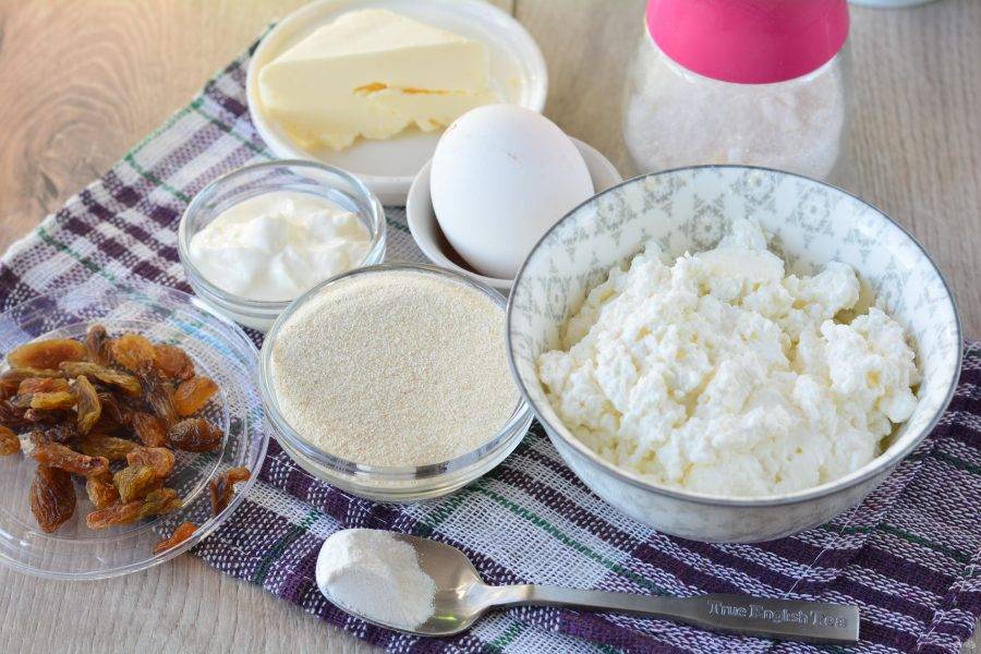 Добавьте промытый и высушенный изюм, всыпьте манку и размешайте. Оставьте заготовку на 15 минут, чтобы манка набухла.