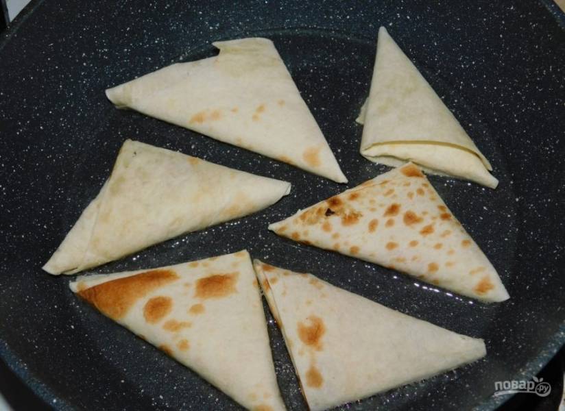 Выложите немного начинки на край лаваша и сверните треугольниками.