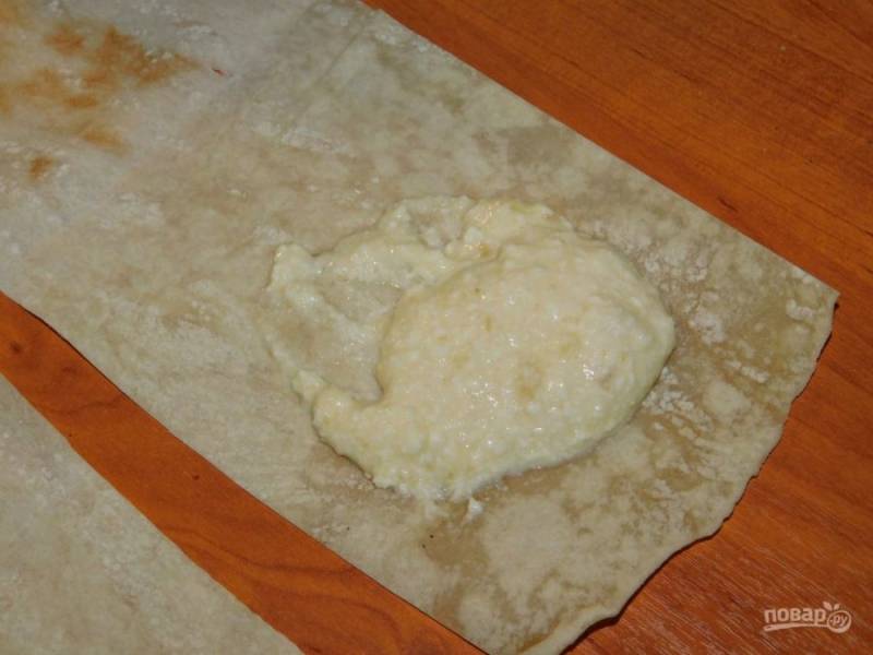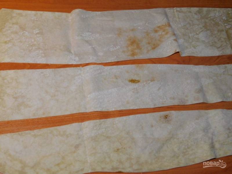 Лаваш нарежьте в длину на полоски. Из 1 листа лаваша у меня получаются 3 полоски.