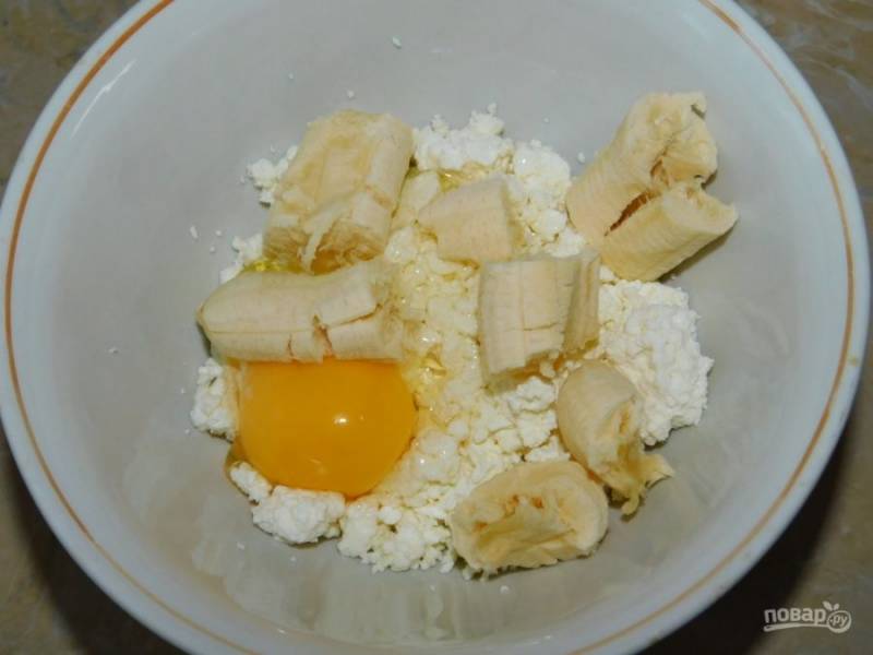 Смешайте творог, яйцо, сахар и банан. Можно все это измельчить с помощью блендера.