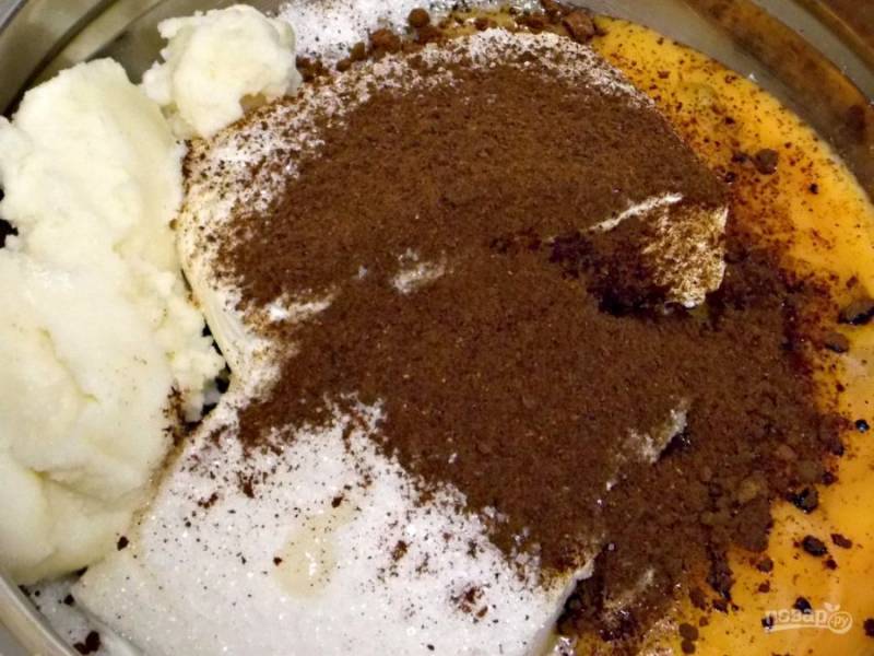 Смешайте кашу, желтки, сахар, творог и черемуховую муку.