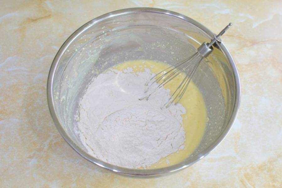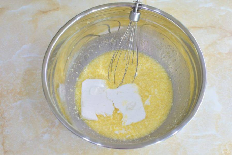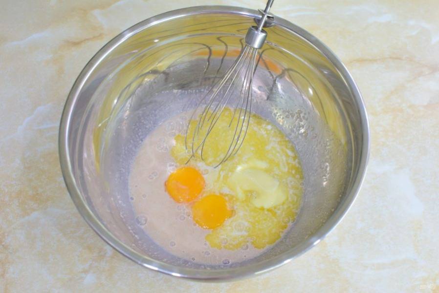 Затем добавьте растопленное масло и яйца. Смешайте.