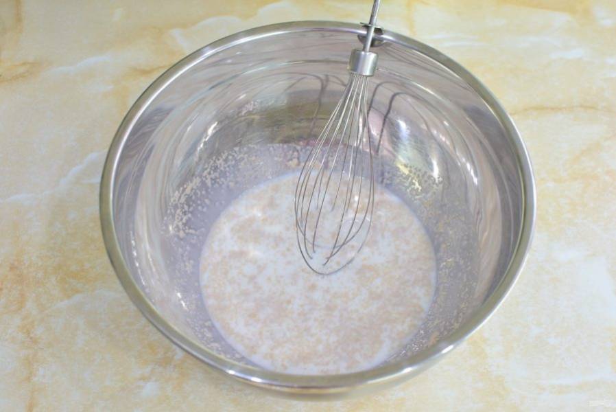 В чашу налейте теплое молоко и добавьте соль и сахар.