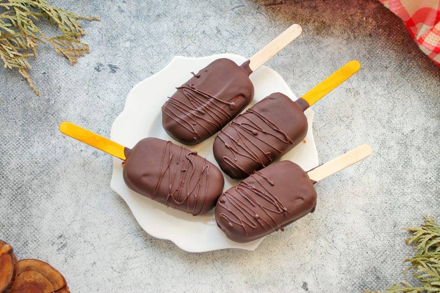 Горький шоколад мелко поломайте и выложите в высокий стакан, в который без труда войдет мороженое. Влейте в шоколад масло и растопите в микроволновой печи в импульсном режиме, перемешивая, до однородности. Каждое мороженое окуните в шоколад, отстучите по краю стакана, чтобы убрать лишний шоколад и выложите на поднос, застеленный пленкой. Шоколад быстро застынет, поэтому украшайте мороженое сразу. Уберите в холодильник на 10 минут и подавайте к столу.