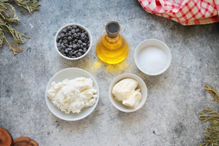 Подготовьте все необходимые ингредиенты для приготовления творожного мороженого. Сливочное масло достаньте из холодильника заранее, чтобы оно стало мягким. Если шоколад большим куском, мелко порежьте или натрите на крупной терке.