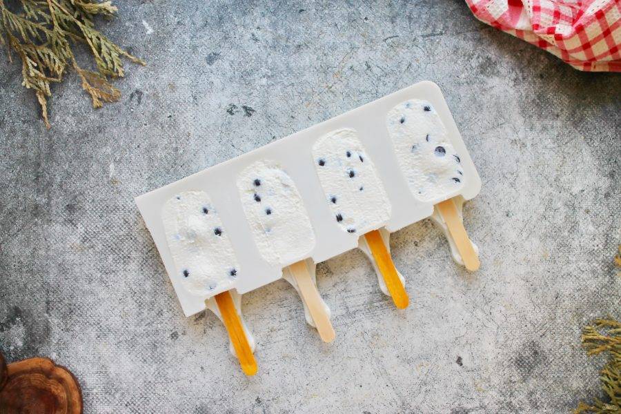 Творожную массу разложите в силиконовые формочки для мороженого и вставьте палочки. Уберите форму на один час в холодильник, а затем на 30 минут в морозильную камеру.