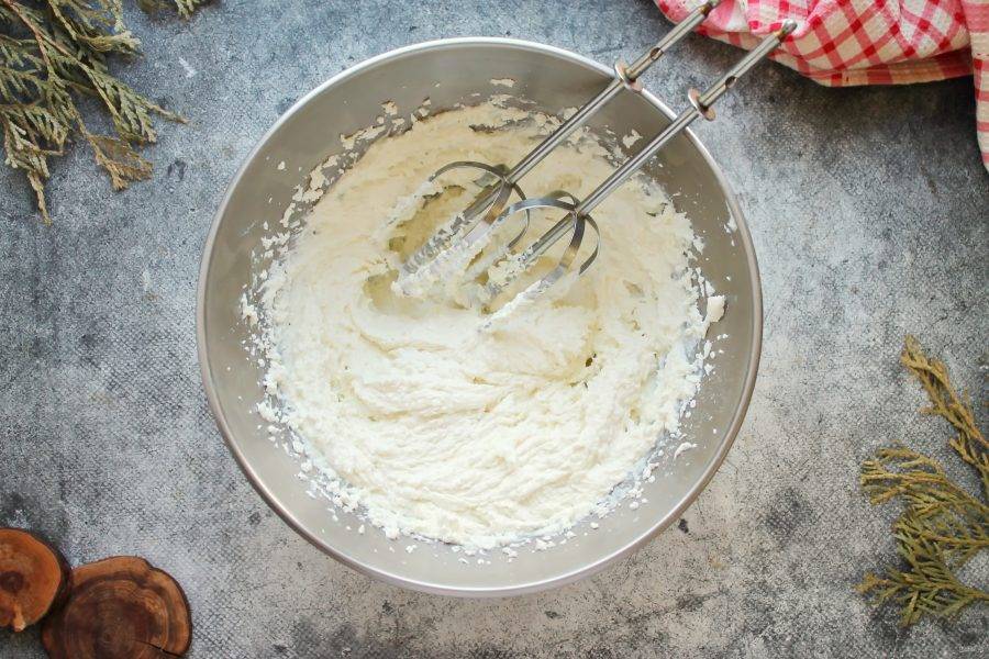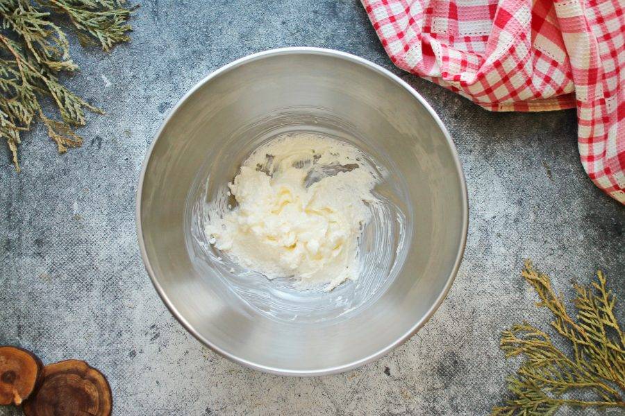 Мягкое сливочное масло, соедините с сахарной пудрой и взбейте миксером до пышной, белой массы. На это уйдет примерно 5 минут.