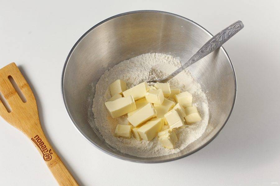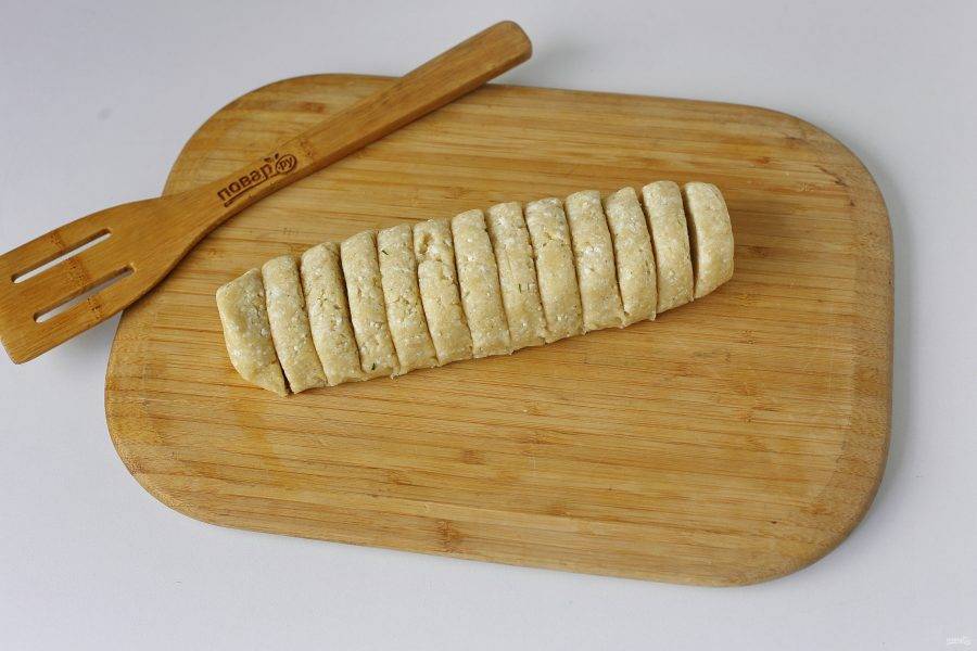 Сформируйте из теста колбаску, заверните ее в пищевую пленку и уберите в холодильник на 30 минут. Затем достаньте и нарежьте на кусочки, шириной 1 см.