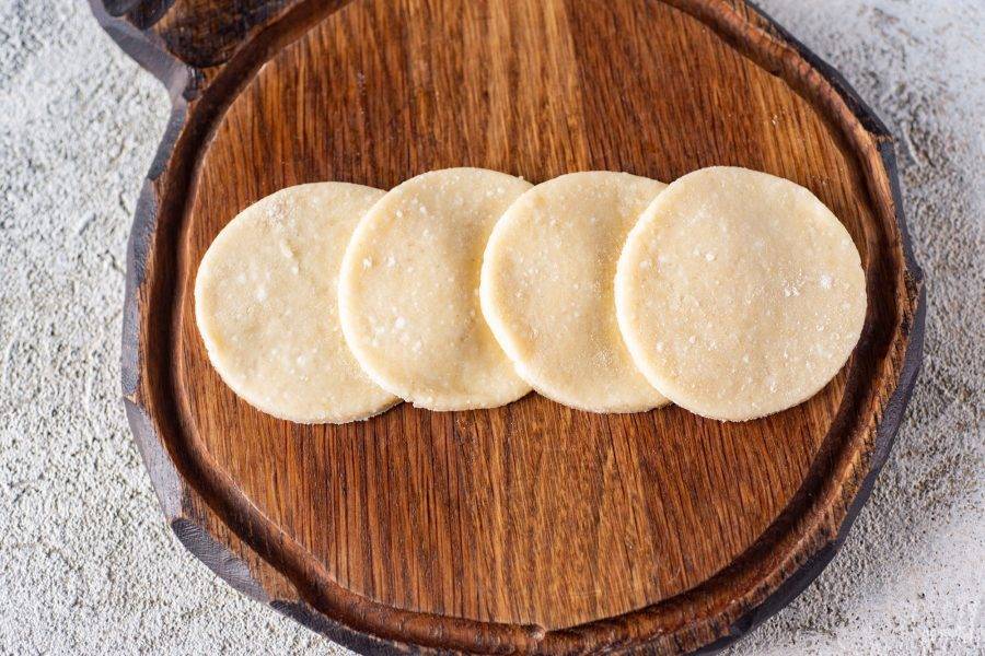 Рабочую поверхность чуть припылите мукой и раскатайте скалкой творожное тесто в пласт толщиной примерно в 3 мм. На поверхности теста выдавите кондитерской формочкой кружочки.