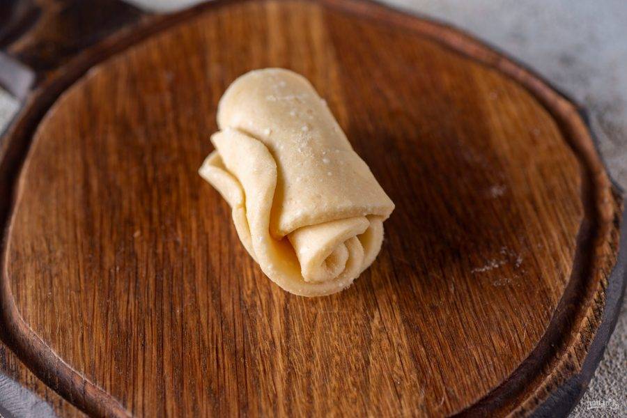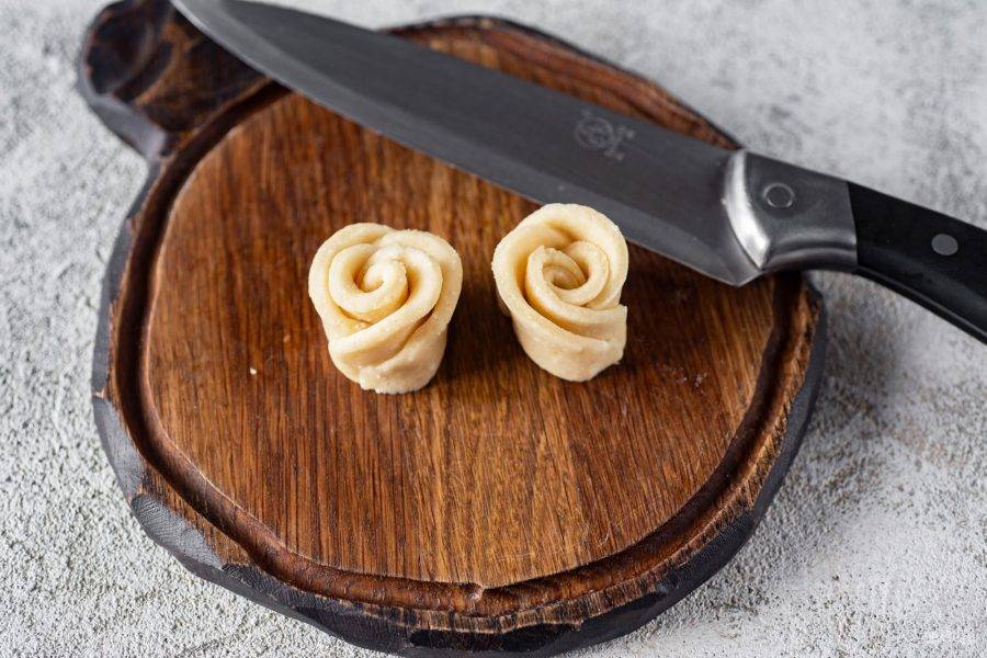 Этот рулетик разрежьте ножом на две одинаковые части так, чтобы получились две розочки. Так же поступите со всеми кружочками и заготовьте розочки из всего теста.