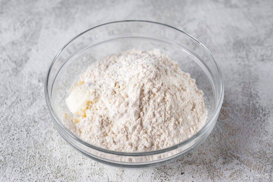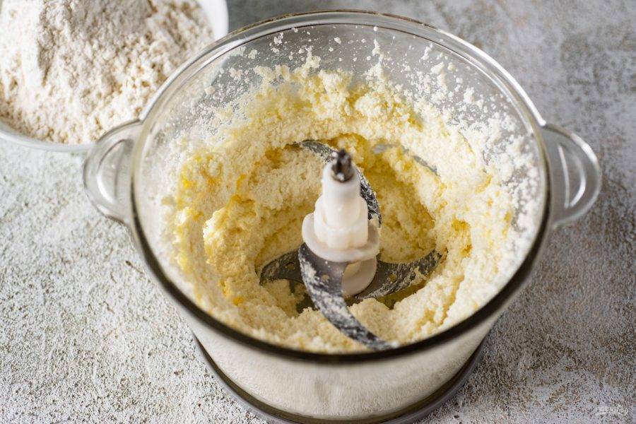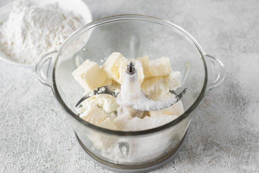 Приготовьте тесто. В чашу стационарного блендера выложите творог, сахар, соль и мягкое масло, нарезанное кусочками.