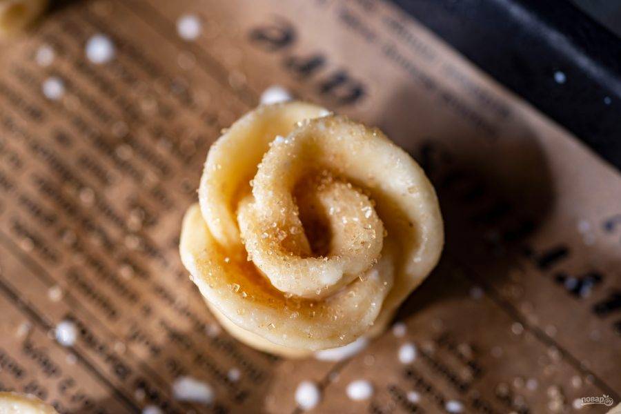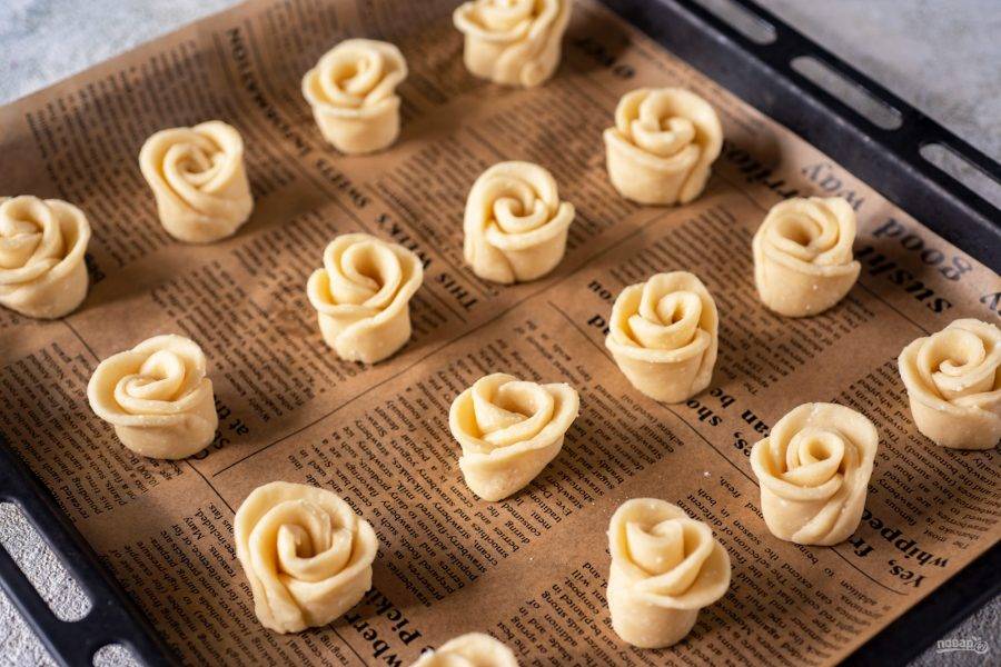 Все розочки-заготовки выложите на противень, застеленный пергаментом для выпекания.