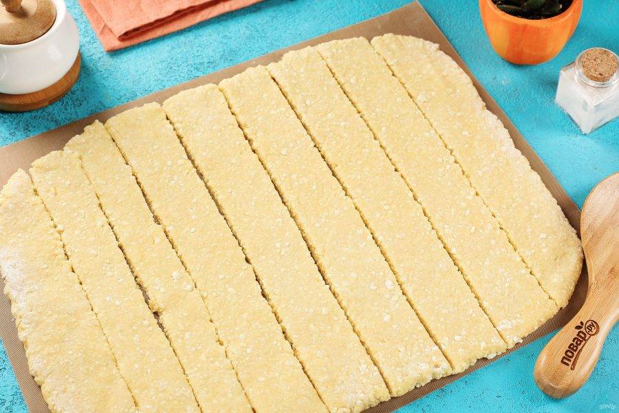 Раскатайте тесто в пласт и нарежьте полосками. Число полос должно быть кратным 3. Если хотите булочки небольшие, то можно разрезать полосы пополам.