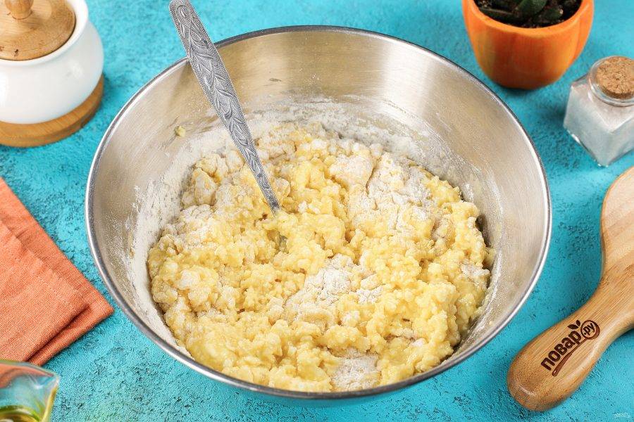 Затем частями добавьте муку. Сначала перемешайте тесто ложкой, а затем продолжите замес руками.