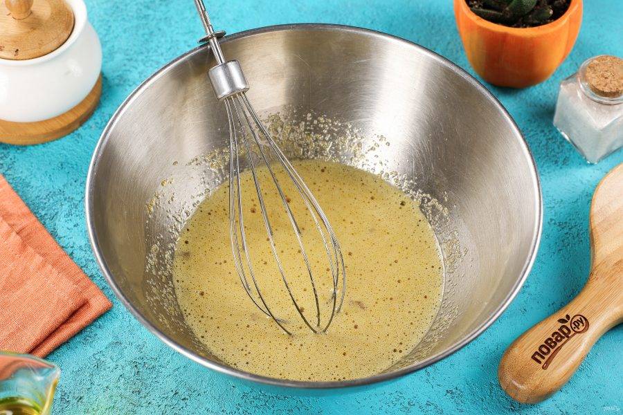 Добавьте творог, разрыхлитель и масло. Хорошо перемешайте, растирая крупные кусочки творога вилкой или лопаткой.
