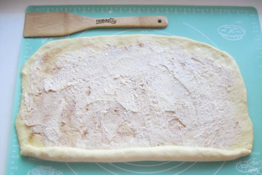 Посыпьте пласт теста смесью сахара с корицей, выложите творог.