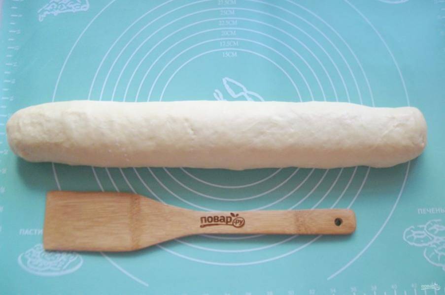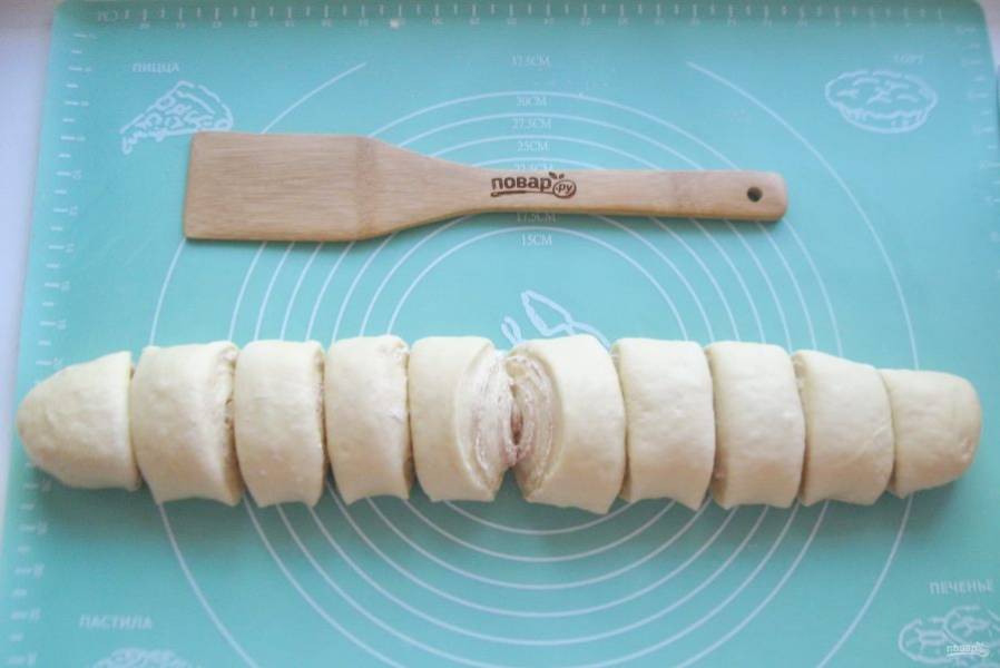 Нарежьте рулет острым ножом на булочки шириной 3-4 сантиметра.